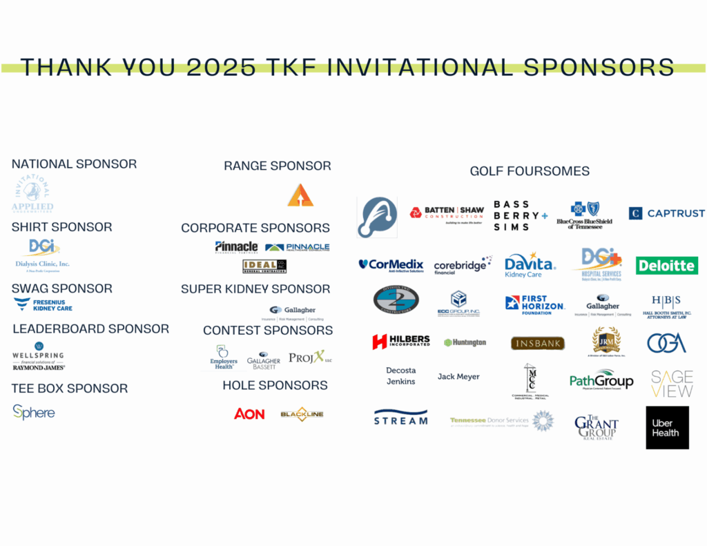 We are excited to announce the Tennessee Kidney Foundation Applied Underwriters Golf Invitational will take place on Monday, August 18, 2025 at The Governors Club in Brentwood, Tennessee! Two shotgun starts will be offered, at 7:30am and 1:30pm CST. Register today to secure a spot in your preferred round and join us as we raise funds to support the programs of the Tennessee Kidney Foundation!